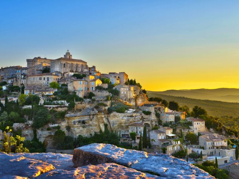Les couleurs des falaises d’ocre se révèlent particulièrement belles au coucher du soleil. La place de la mairie est un excellent endroit pour faire une pause et prendre un verre.